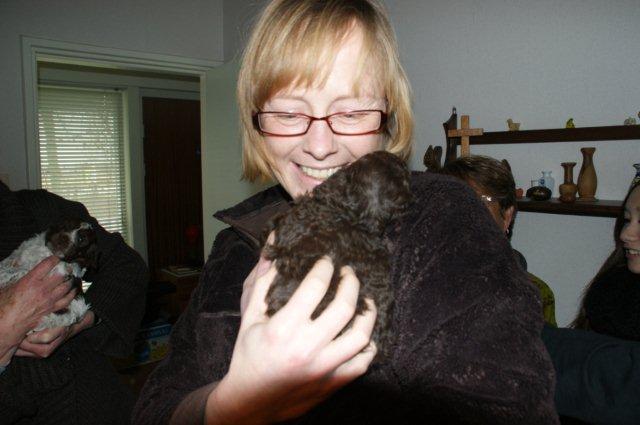 Allemaal dan voor het eerst een pup in de handen. De nieuwe eigenaren genieten met volle teugen. Op de achtergrond, zonder pup in de handen zie je nog net Ruth Mauti, die samen met haar man en hun 3 honden bij ons logeren. De pupkopers kunnen nu dus de vader (Baleno-Juno) van hun pups ook ontmoeten. Ruth heeft zelfs echte truffels meegenomen, vers gevonden met hun honden, en heeft er een heerlijke saus van gemaakt voor over de pasta en iedereen kan er van proeven!