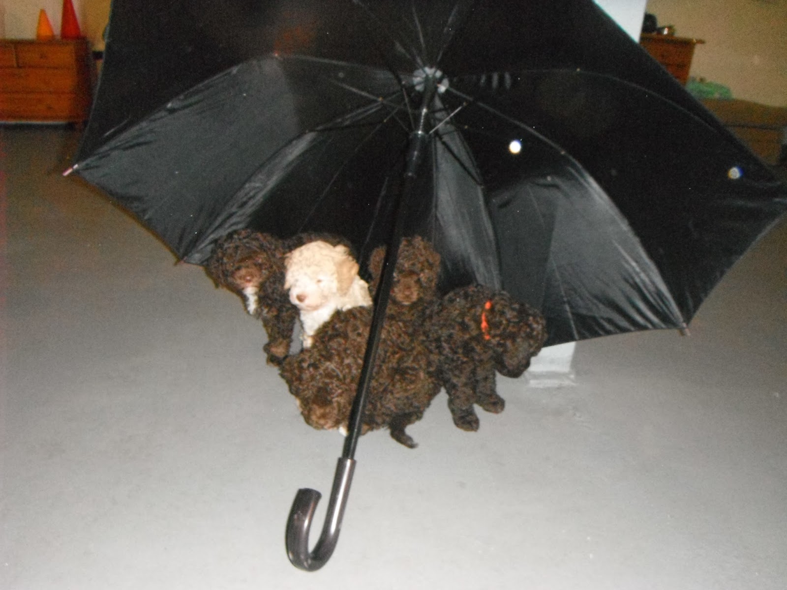 Zo’n eerste keer in een nieuwe omgeving zie je goed hun karakter. Witteentje vindt het enorm spannend. Sahare is voorzichtig, maar is de eerste die komt snuffelen aan de neus van een grote Akita!Blauw en oranje komen dichtbij, maar geen neuscontact. Jammer dat het bestand te groot was! Als ze ergens van schrikken kruipen ze met z’n allen onder de paraplu! Yvonne schuift met een metalen bak, gooit speelgoed op de grond, klapt een paar keer in de handen en dat soort dingen. Het geeft veel informatie over hun aanleg wat karakter betreft. Aanleg kan met goede begeleiding veel kanten op.